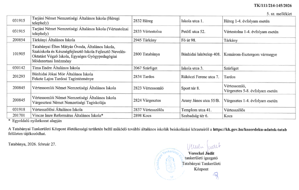 Alább találja a Tatabányai Tankerületi Központ fenntartásában lévő általános iskolák felvételi körzeteit. A dokumentum közvetlenül elérhető, és letölthető erre a szövegre kattintva, valamint a bal oldali menüből a Dokumentumokon belül a Közérdekű információkra kattintva.