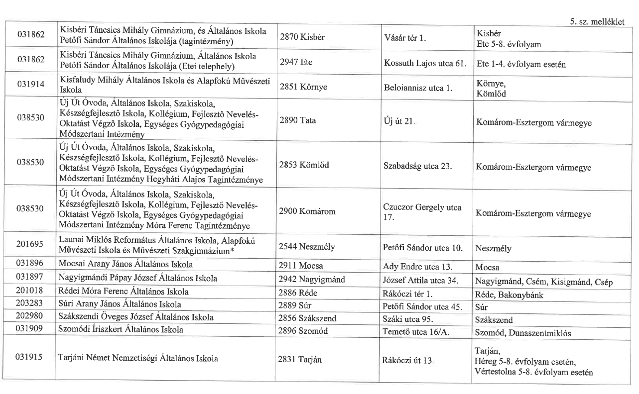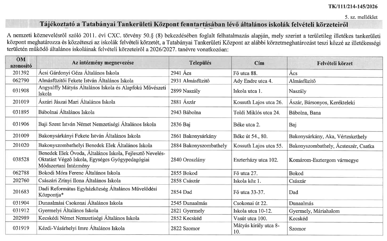 Alább találja a Tatabányai Tankerületi Központ fenntartásában lévő általános iskolák felvételi körzeteit. A dokumentum közvetlenül elérhető, és letölthető erre a szövegre kattintva, valamint a bal oldali menüből a Dokumentumokon belül a Közérdekű információkra kattintva.